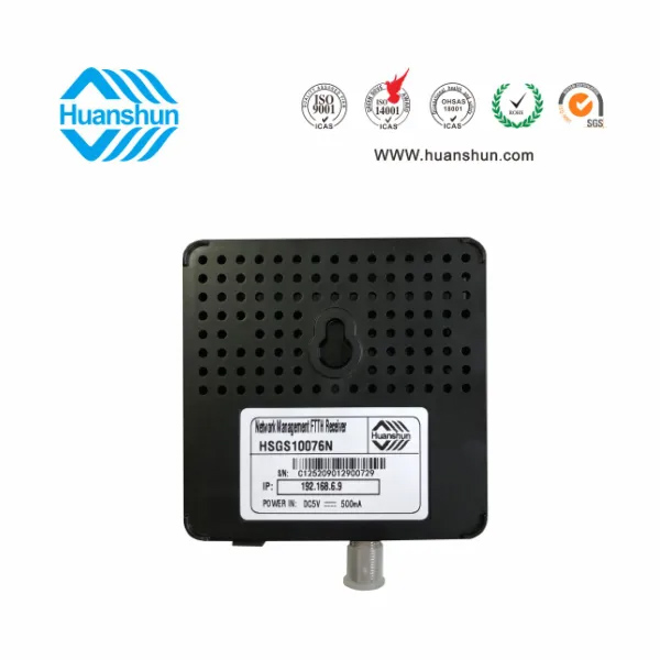 網管型帶濾波 FTTH 光接收機 | HSGS10076DN | 1540~1650nm接收,-2~-12dBm/RFMD 82dBuv恒定輸出,(RJ45標準網口),外置90~255V 5V 0.5A電源適配器 |