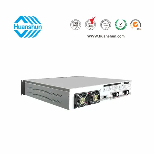 19 " 2U標準機箱,-5 ~ +10 d Bm輸入,4路標稱規格(16、17、18、19、20、21、22、23dBm)放大輸出,并支持下調-2dB,安全連接模式,NF ≤ 5dB(0dBm時);內置FWDM合波器,插播損耗 ≤ 1dB;雙模塊熱插撥電源,AC90 ~ 255V或DC-48V供電,RJ45標準網管(支持SNMP、WEB)